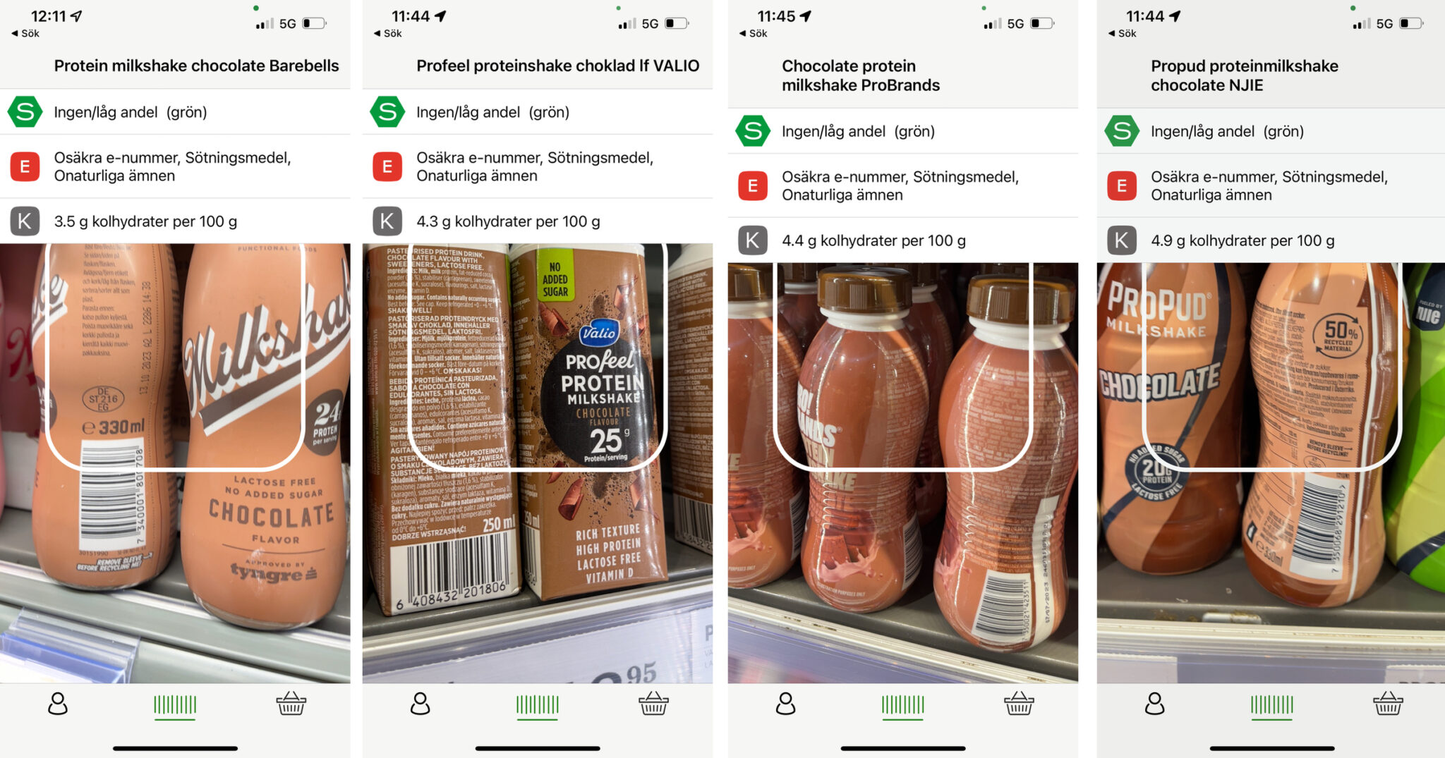 Här i Sverige har problemen med karragenan knappt uppmärksammats. Men förra helgen tog jag mig en tur i lite olika butiker för att undersöka hur vanlig tillsatsen är i svenska chokladdrycker. Jag skannade produkterna med vår app Matchecken som fångar upp karragenan om man slår på filtret för ”osäkra E-nummer”. Här är screenshots av det jag hittade: